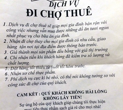 Trên các diễn đàn, mạng xã hội, không khó để tìm dịch vụ đi chợ thuê. Thậm chí, dịch vụ đi chợ thuê còn gõ cửa từng nhà dân để mời chào khách hàng với những câu quảng cáo khá hấp dẫn, như: “Dịch vụ đi chợ thuê sẽ giúp mọi gia đình bận rộn với công việc nhưng vẫn mua được những đồ ăn tươi ngon nhất phục vụ cho bữa cơm gia đình”. Hay “Nhận đi chợ thuê thay cho mọi gia đình có nhu cầu, giao hàng tại địa chỉ được thông báo trước. Giá thành mọi sản phẩm bằng với giá thị trường. Cam kết phí dịch vụ cực kỳ nhỏ”,...