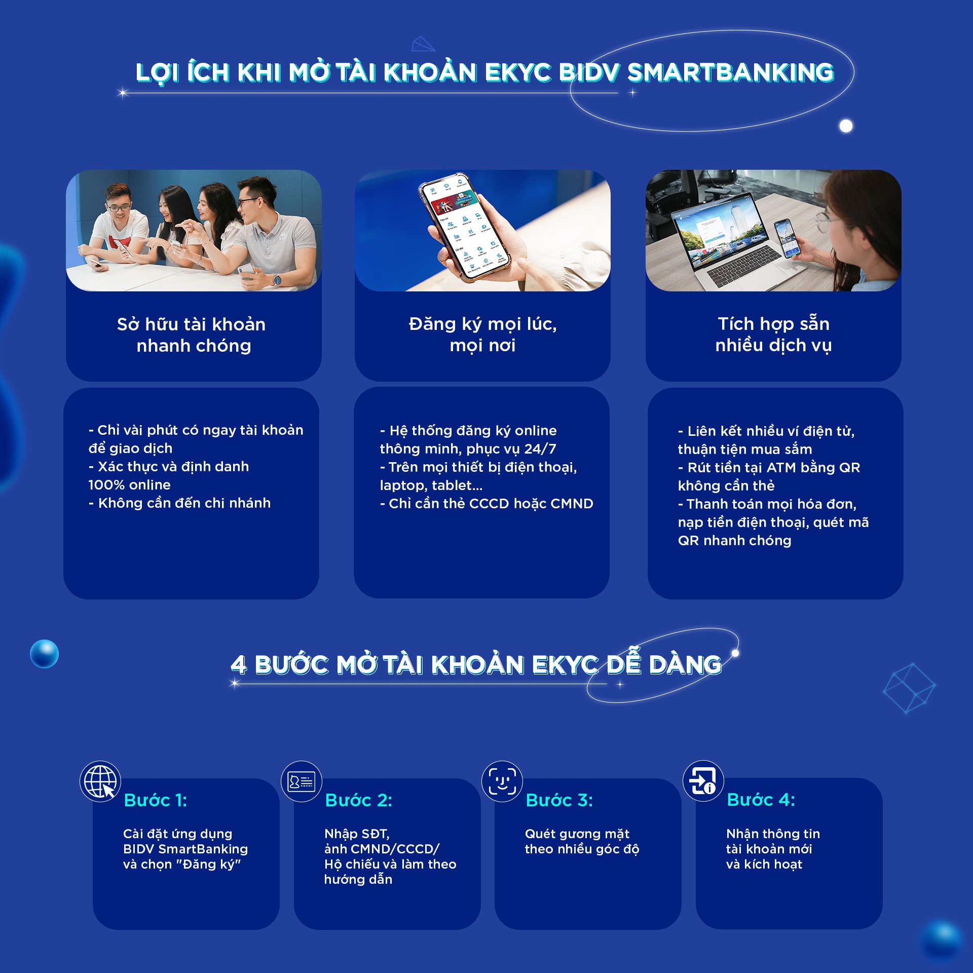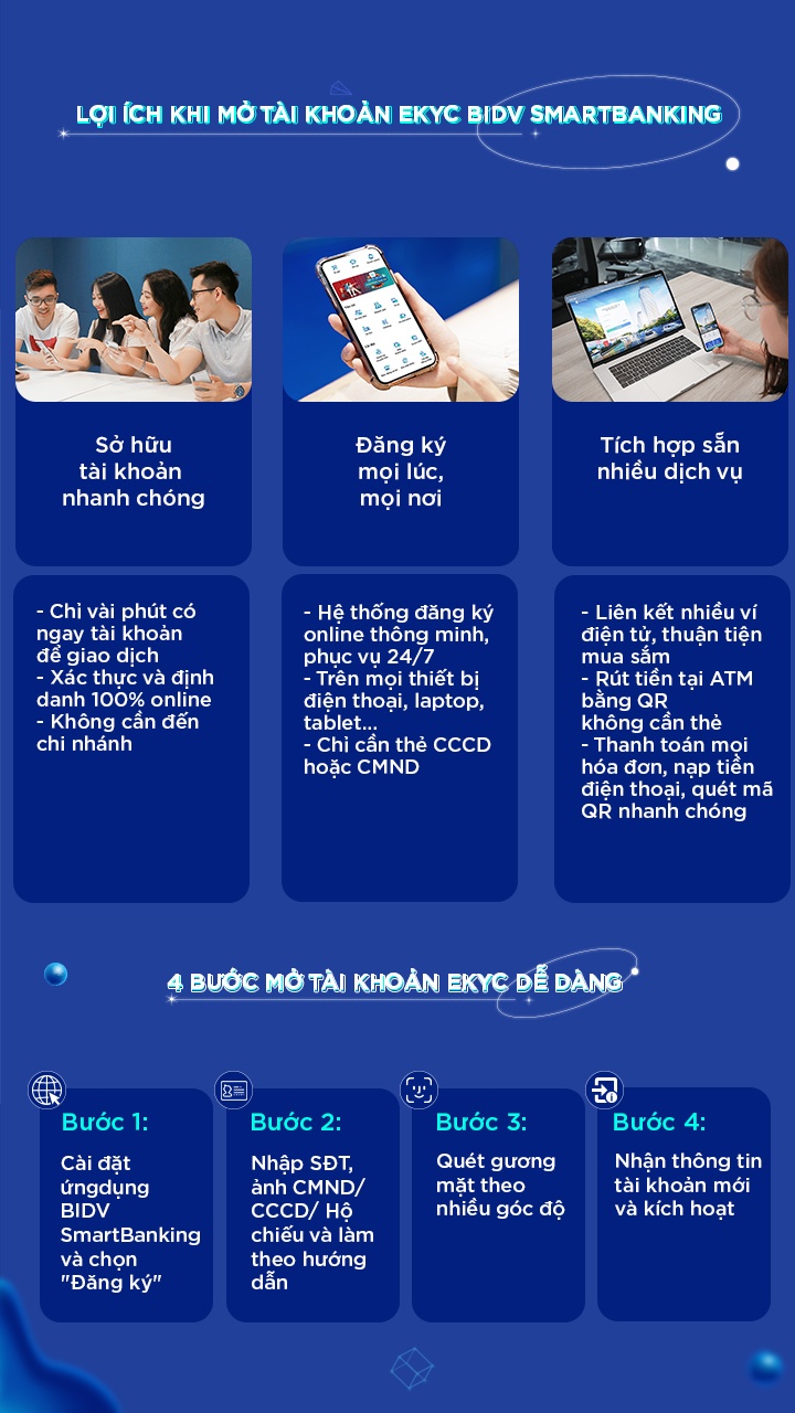 Với eKYC, BIDV SmartBanking có thể vượt qua mọi rào cản địa lý và thời gian để định danh khách hàng 100% online, dựa vào các thông tin sinh trắc học (biometrics) mà không cần gặp mặt trực tiếp như quy trình hiện tại.