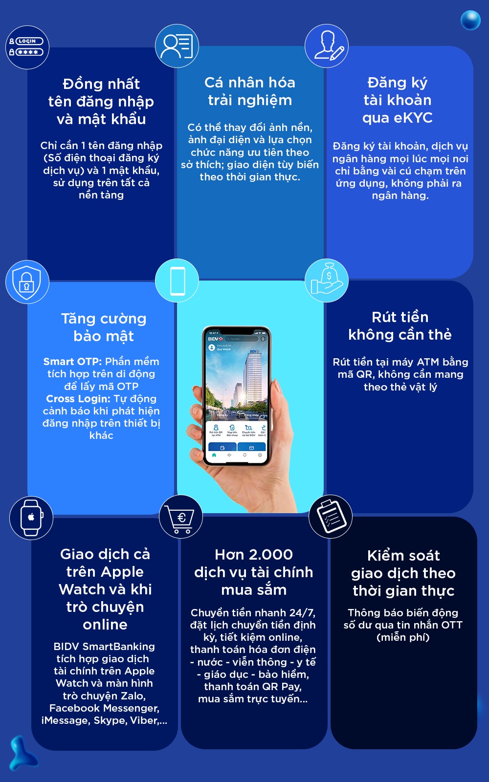 Trong guồng quay hối hả của cuộc sống hiện đại, để chu toàn công việc và đời sống cá nhân, mỗi người đều cần các công cụ giúp đơn giản hóa mọi thao tác và tiết kiệm thời gian. Thấu hiểu nhu cầu mà đa phần người dùng hướng đến, BIDV tích hợp hệ sinh thái tiện ích thiết thực trên SmartBanking thế hệ mới.