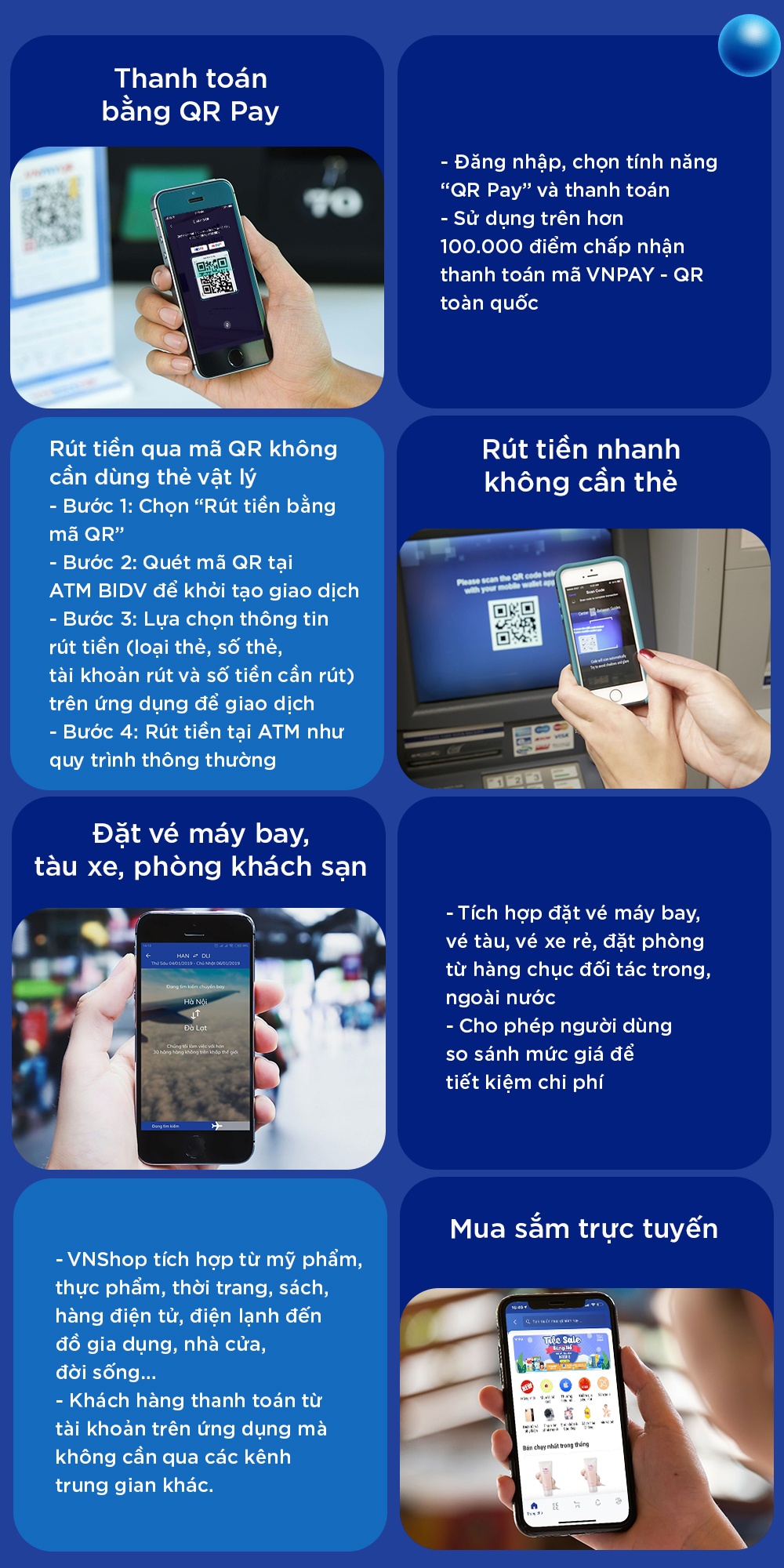 Ngoài các tính năng quen thuộc như chuyển tiền, thanh toán hóa đơn, nạp tiền điện thoại... ứng dụng còn cho phép người dùng đặt phòng, đặt vé máy bay hay vé xem phim, chuyển tiền qua số điện thoại, thực hiện các loại giao dịch bằng giọng nói, thanh toán hóa đơn qua mã QR... Cùng với đó, khách hàng có thể thanh toán hơn 2.000 dịch vụ trong các lĩnh vực: Giáo dục, viễn thông, giao thông, điện, nước, bảo hiểm, chứng khoán, tài chính tiêu dùng, truyền hình, giải trí, mua sắm trực tuyến…