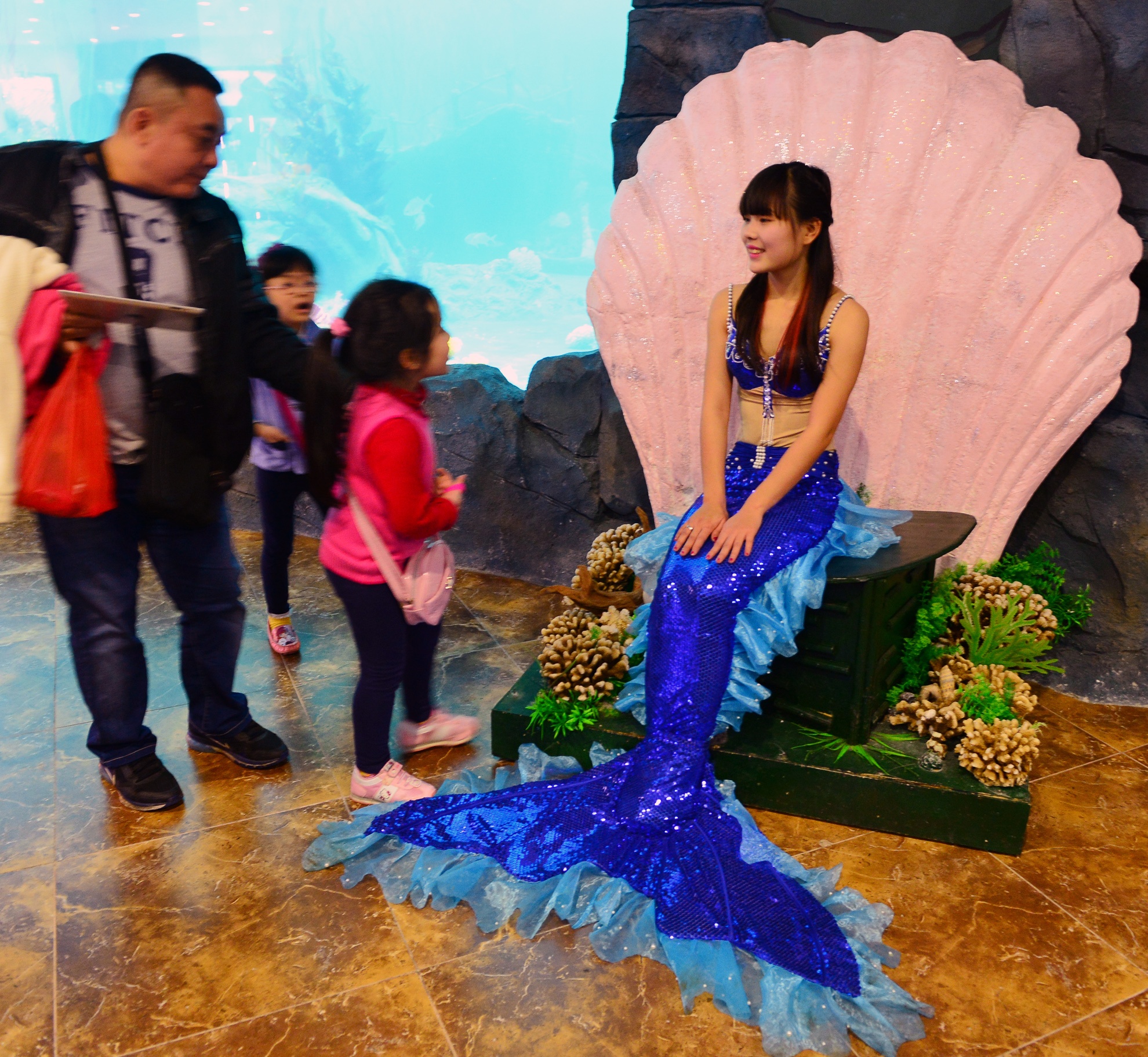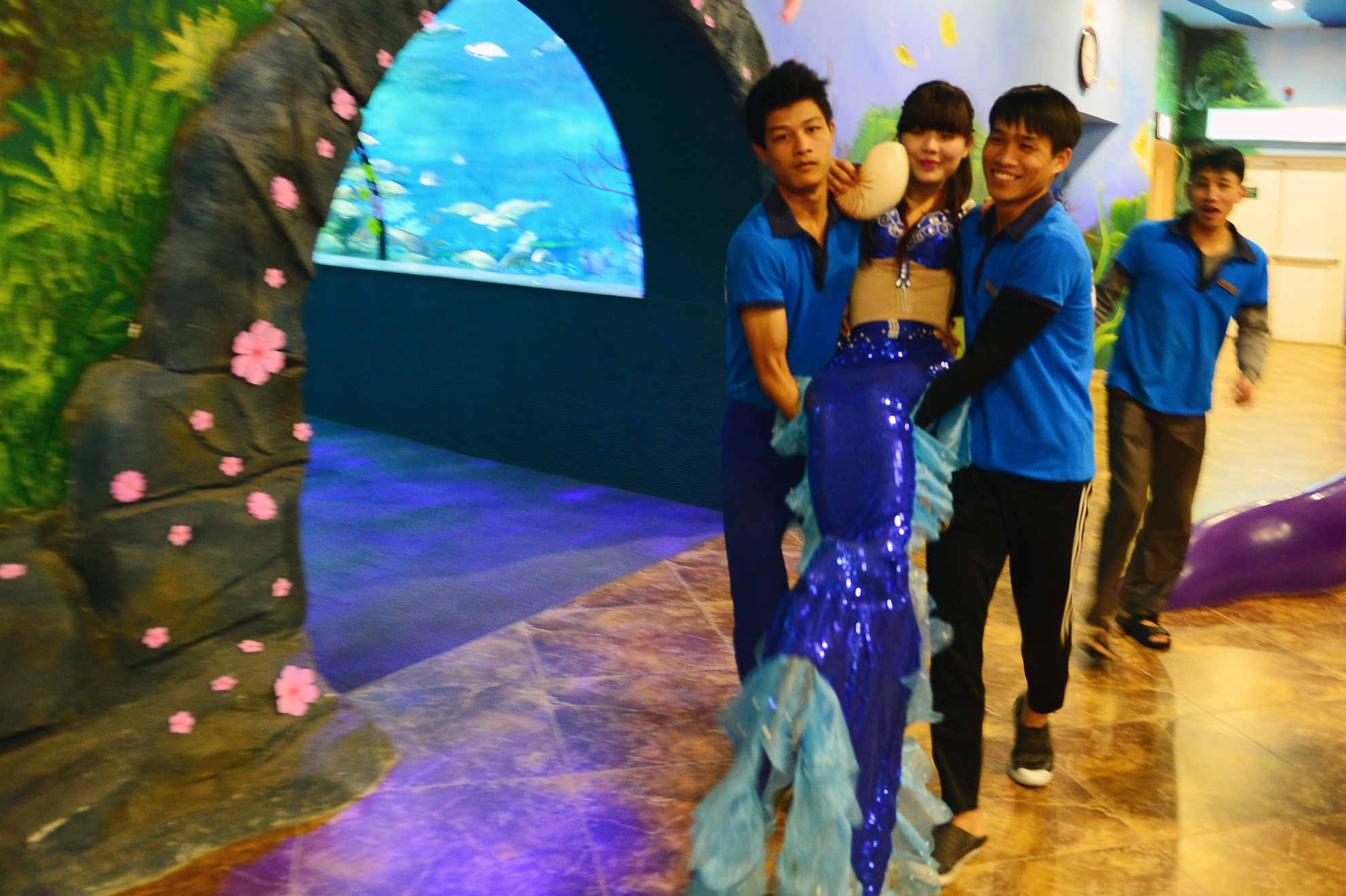 Trong ảnh là Phạm Cẩm Vân (sinh năm 1992), người chuyên đóng vai nàng tiên cá trên cạn. Cô gái người Kiến Xương, Thái Bình này được tuyển vào làm nàng tiên cá mỗi ngày từ 10-30 phút cho khách chụp ảnh, tùy theo đông hay vắng. Vân từng là sinh viên đại học Thủy Lợi, bơi tốt, nhưng nhiệm vụ của Vân là ngồi trên ghế sò ngay khu vực cửa ra của thủy cung.