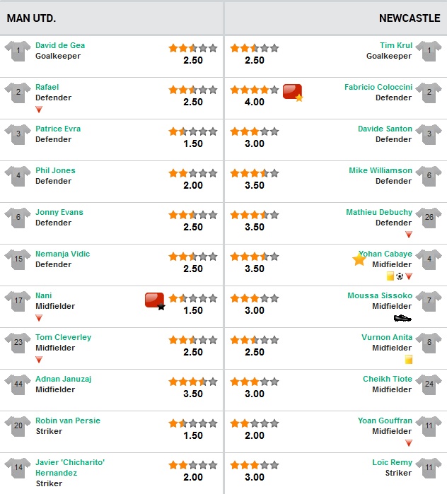 Sau khi MU bị dẫn bàn, tiền đạo người Hà Lan đưa được bóng vào lưới Newcastle bằng một pha đánh đầu cận thành, nhưng đáng tiếc là Vua phá lưới Ngoại hạng Anh lại dứt điểm ở thế việt vị. Màn trình diễn yếu kém trước Newcastle khiến Van Persie chỉ được chấm 1,5 điểm trong thang điểm 5. Đây là điểm thấp nhất trận MU – Newcaslte.