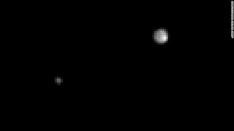 Hình ảnh về Diêm Vương tinh và vệ tinh lớn nhất của nó – Charon. Theo Cơ quan Hàng không vũ trụ Mỹ (NASA), New Horizons bay trong không gian với vận tốc gần 31.000 km/h, cách bề mặt sao Diêm Vương khoảng 12.400 km lúc 11h49 theo giờ GMT (18h49 theo giờ Hà Nội).