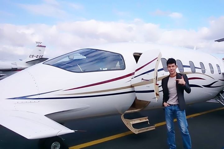 Nathan Lee không giấu được sự vui thích khi tạo dáng bên chiếc máy bay được cho là của Thu Minh.