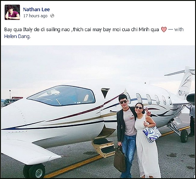 Cách đây không lâu, Nathan Lee bất ngờ khoe trên trang cá nhân hình ảnh mình và Thu Minh ôm nhau thân thiết bên một chiếc máy bay tư nhân màu trắng. Không dừng ở đó, anh còn khẳng định: "Thích cái máy bay mới của chị Minh quá". Thông tin này khiến nhiều người tin rằng chiếc máy bay nhỏ xinh này là tài sản thuộc về nữ ca sĩ Yêu mình anh.