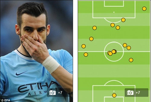 Bản đồ nhiệt cho thấy cựu chân sút của Sevilla hoạt động mạnh ở vòng tròn trung tâm trên sân. Cụ thể, tuyển thủ người Tây Ban Nha chỉ có bóng sau khi Jordi Gomez ghi bàn mở tỷ số, ở thời điểm bắt đầu hiệp 2 với quyền giao bóng thuộc về Man City và sau khi James Perch nâng tỷ số lên 2-0.