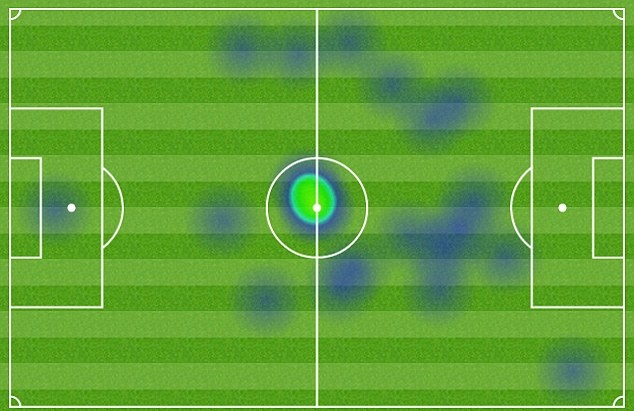 | Bản đồ nhiệt thể hiện phạm vi hoạt động của Negredo. Trong trận đấu, tiền đạo người Tây Ban Nha chủ yếu có bóng ở vòng tròn trung tâm trên sân. |