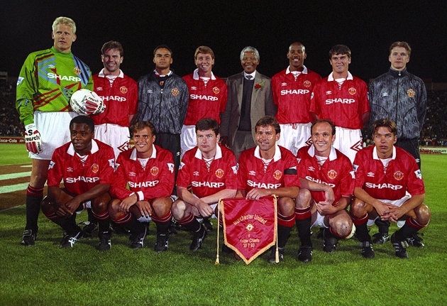 | Năm 1993: Tổng thống Mandela chụp ảnh cùng đội bóng "Quỷ đỏ" Manchester United khi đội bóng Anh tham gia trận đấu giao hữu với Kaizer Chiefs tại Nam Phi. |