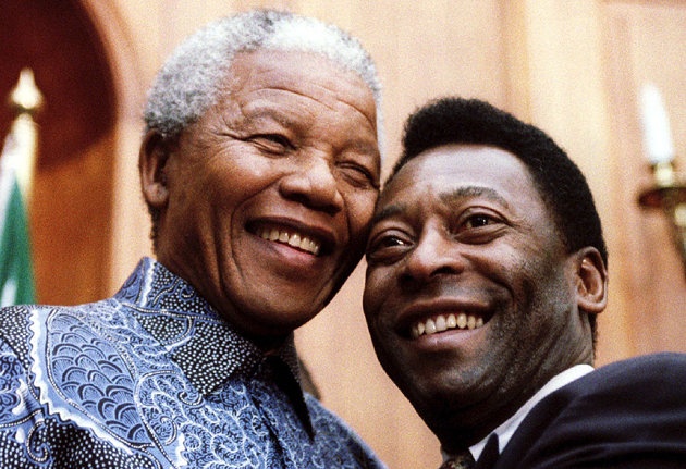 Năm 1995: Mandela chụp ảnh cùng "Vua bóng đá" Pele trước thềm trận đấu giao hữu giữa Nam Phi và Brazil. |