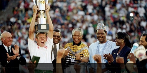 Năm 1995: Tổng thống Nam Phi đại diện Webb Ellis trao cúp cho đội trưởng rugby Nam Phi Francois Pienaar sau mùa bóng thành công rực rỡ (Nam Phi lên ngôi vô địch với động lực rất lớn từ CĐV nhiệt tình nhất - Nelson Mandela). |