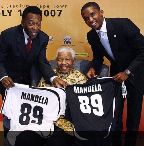 | Năm 2007: Pele và Samuel Eto'o mừng sinh nhật tuổi 89 của cựu tổng thống Nam Phi. |
