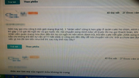 “Tôi gọi điện cho công ty trên thì được nhân viên hẹn gặp ở quán cà phê để nói chuyện. Tiếp xúc với tôi là 2 cô gái, họ cho biết muốn tìm người mang thai hộ thì phải có những thủ tục và điều kiện gì. Lúc kêu tính tiền, 2 cô gái này ngồi im nên tôi phải trả. Các cô ấy còn yêu cầu tôi phải trả 200.000 đồng phí dịch vụ tư vấn”, chị Mai thuật lại câu chuyện.