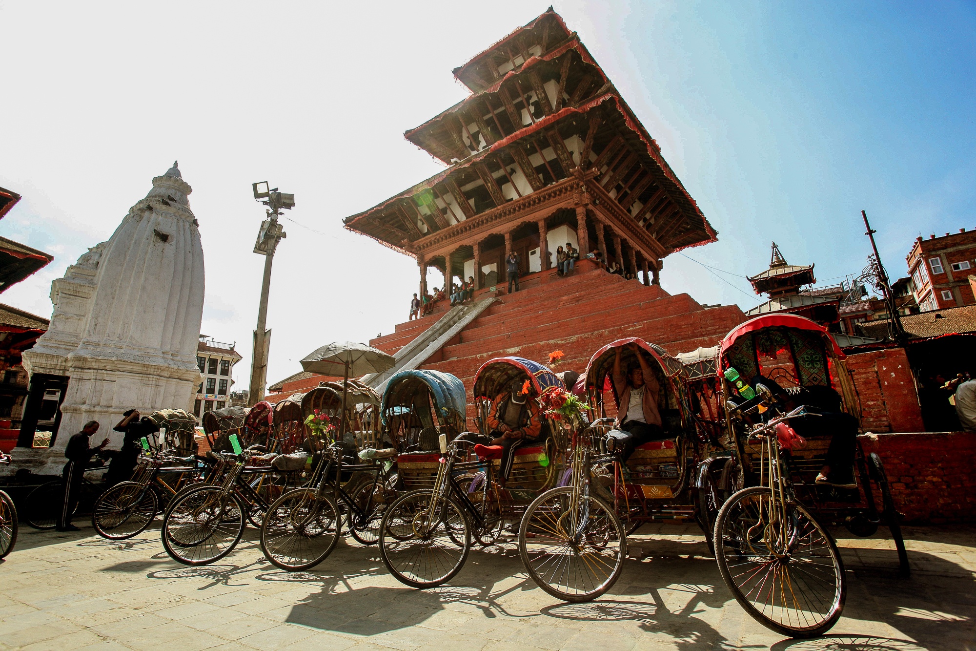 Những chiếc xe lôi tránh nắng dưới đền Maju Dega, thuộc quảng trường Durbad, Kathmandu. Ảnh chụp 2 năm trước, trong một chuyến đi qua nhiều quốc gia quanh Himalaya. Tác giả: Nguyễn Trần Hùng.