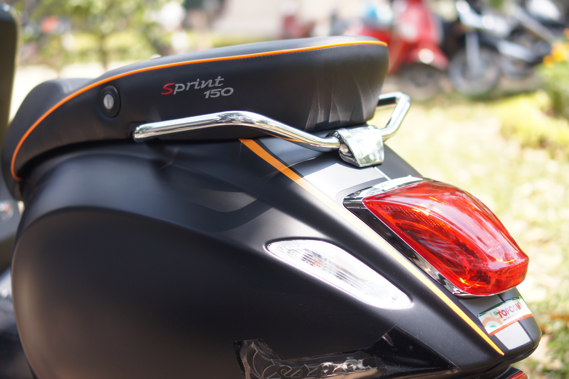 | Đuôi của Vespa Sprint 150 cũng được trang trí như GTS Super 150, với tên xe thêu trên yên và những chi tiết màu cam nổi bật. |