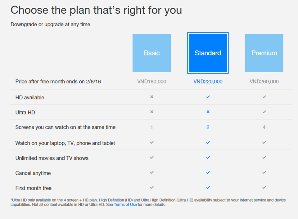 Hiện trên trang chủ của Netflix, người dùng Việt Nam có thể đăng ký các gói dịch vụ, bắt đầu từ 180.000 đồng và cao nhất là 260.000 đồng mỗi tháng. Để xem được độ phân giải HD, người dùng phải chọn gói Standard (220.000 đồng/tháng) và Ultra HD chỉ có ở gói Premium (260.000 đồng/tháng).