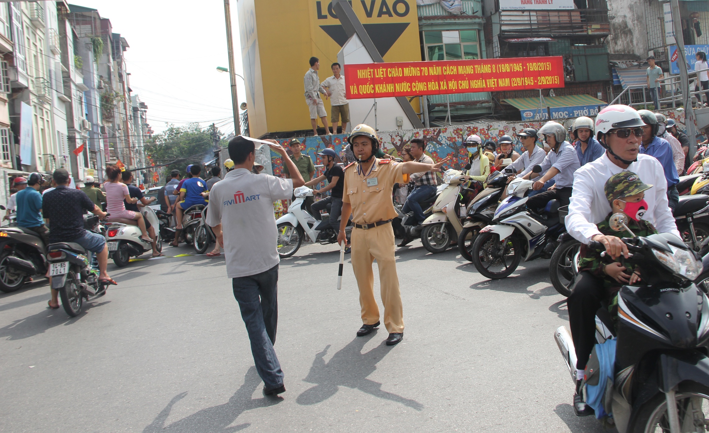 | CSGT điều tiết phân luồng tại trung tâm Hà Nội. Ảnh: M.H. |