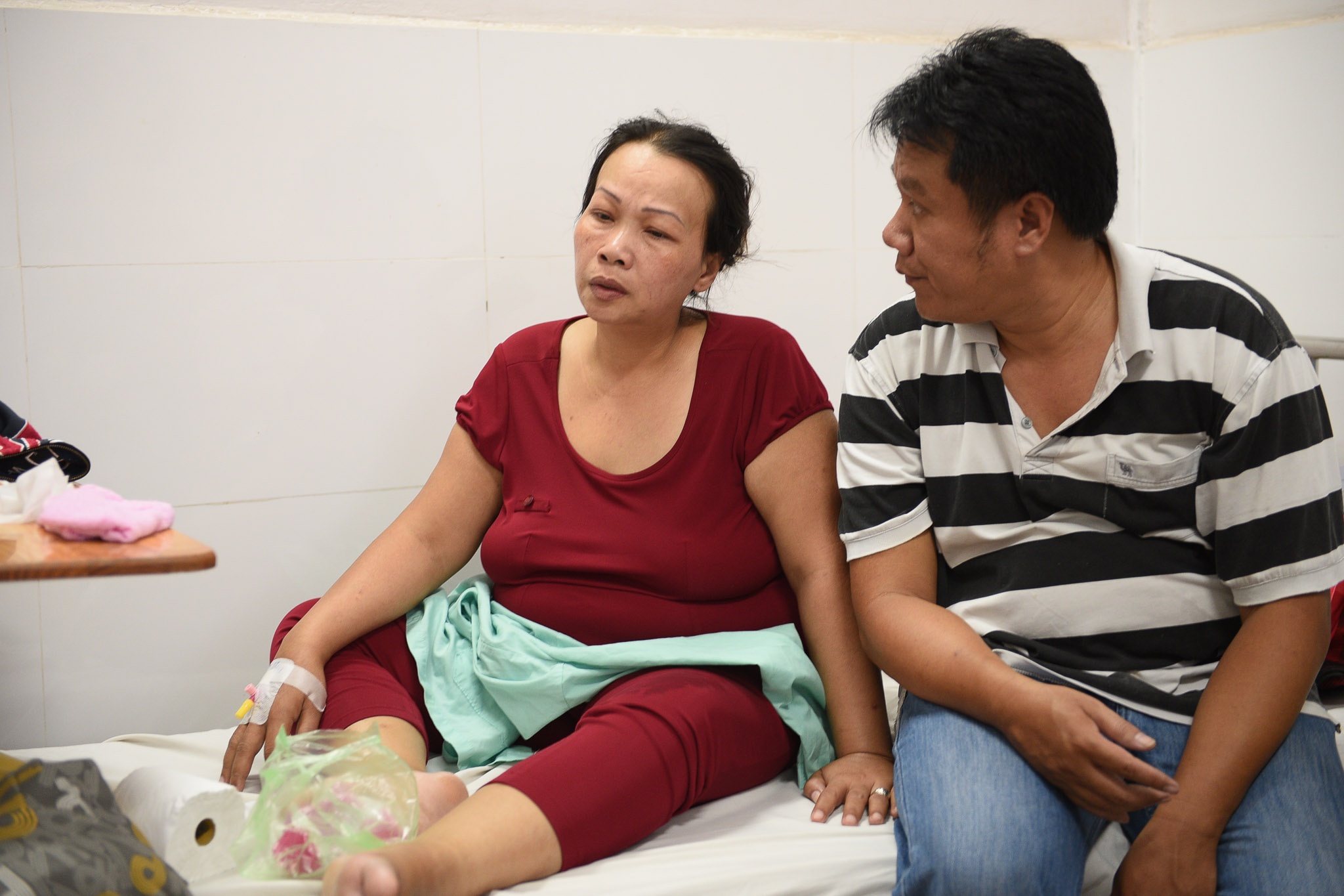 Kim Loan không nằm được vì tức ngực, khó thở nhưng ngồi dậy lại choáng váng vì tụt huyết áp. |