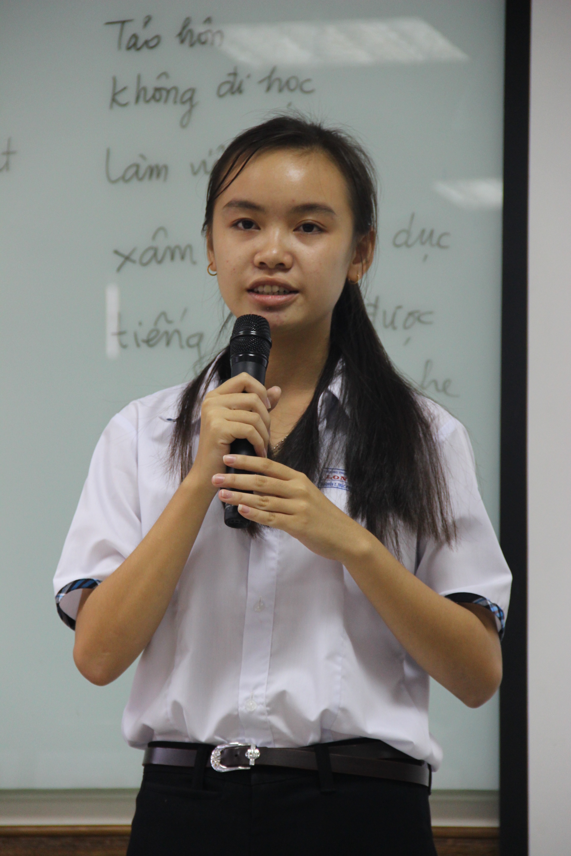 Tại buổi trao đổi học thuật, ba bé gái đã chia sẻ những khó khăn đã và đang gặp phải trong cuộc sống, đặc biệt là giáo dục. Em Nguyễn Thị Trúc Phương, học sinh lớp 12, trường THPT Long Mỹ, tỉnh Hậu Giang, nói: “Có những lúc em nghĩ, nếu là nam, em sẽ có nhiều điều kiện đến trường hơn”. Ước mơ của Phương là học đại học, giúp đỡ gia đình.