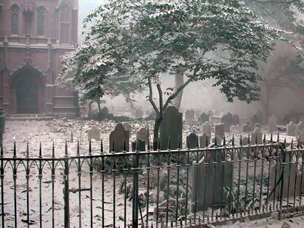 | Nhà thờ Trinity, gần công trình sụp đổ, bị bụi bao phủ hoàn toàn. Ngày nay, màu xanh yên bình là sắc màu chủ đạo ở đây. |