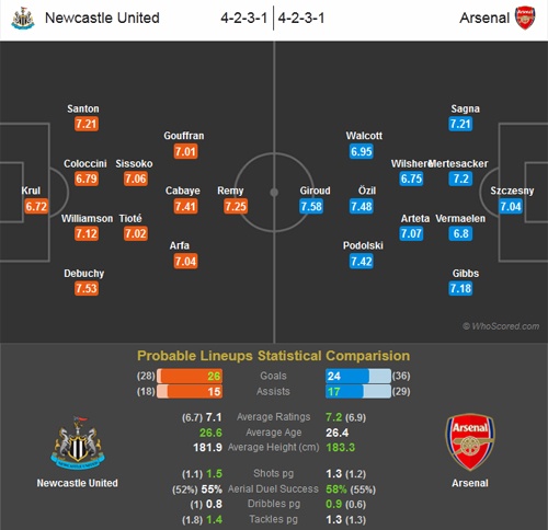Dù Arsenal đang có thành tích bất bại trong 6 lần gần nhất đến sân của Newcastle, nhưng thầy trò HLV Wenger cần phải cẩn trọng ở trận sắp tới gặp Chích chòe. Trong 6 vòng đấu vừa qua tại St James'Park, đoàn quân của HLV Pardew giành 4 chiến thắng và 2 trận hòa. Đáng chú ý là Newcastle từng vượt qua Chelsea (2-0) và chia điểm với Liverpool (2-2).