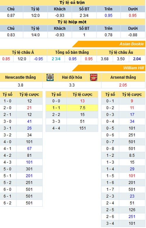 Tỷ lệ châu Á trận Newcastle - Arsenal