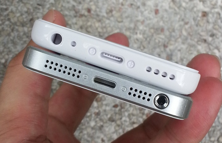 Điểm đáng chú ý nhất ở hai chiếc iPhone mới là chân cắm sạc với chuẩn Lightning thay đổi, nhỏ hơn. Chiếc iPhone 5S có kiểu dáng giống iPhone 5, điểm khác biệt là camera có thể lên 12 Megapixel với đền flash phía sau điều chỉnh về thiết kế mà mic nhỏ gọn hơn. Trong khi đó, bản iPhone 5C sở hữu bộ vỏ nhựa bóng, máy khá gọn.
