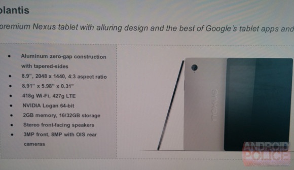 Trang Android Police vừa đăng tải một số hình ảnh cho thấy chiếc máy tính bảng mới này sẽ là Nexus 9, còn có tên mã Volantis (hoặc Flounder) có màn hình cảm ứng 8,9 inch. Độ phân giải màn hình máy khá kỳ lạ: 2.048 x 1.440 pixel. Điều này dẫn đến tỉ lệ khung hình máy sẽ không phải 16:10 như các dòng Nexus trước. Thêm vào đó, nguồn tin này cũng khẳng định Nexus 9 sẽ có tỉ lệ khung hình 4:3 tương tự iPad.