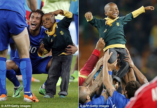 | Sau khi trận đấu kết thúc, một cậu bé người Nam Phi chạy ùa vào sân để gặp Neymar nhưng bị lực lượng an ninh giữ lại. Thật bất ngờ khi ngôi sao đang khoác áo Barca từ từ bước ra, bế fan nhí qua vòng an ninh để vào chụp ảnh và ăn mừng cùng đội tuyển. Cậu nhóc da màu được các cầu thủ Brazil phấn khích tung hê giữa sân. |