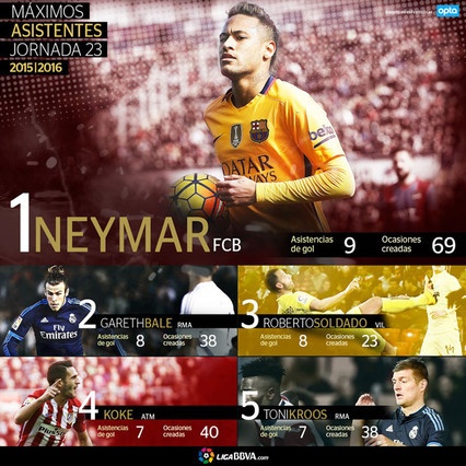Những con số trên là minh chứng rõ rệt cho thấy tầm quan trọng của Neymar với hàng công Barcelona. Anh thậm chí còn dẫn đầu danh sách những cầu thủ tấn công hiệu quả nhất xứ bò tót khi xếp trên cả Gareth Bale, Roberto Soldado, Koke và Toni Kroos. Được biết, Bale chỉ có 8 pha kiến tạo và tạo ra 38 cơ hội, trong khi Soldado có 8 pha kiến tạo và có 23 cơ hội. Với Koke, tiền vệ này thực hiện 7 đường dọn cỗ và tạo ra 40 cơ hội, còn Toni Kroos tung ra 7 pha kiến tạo và 38 cơ hội.