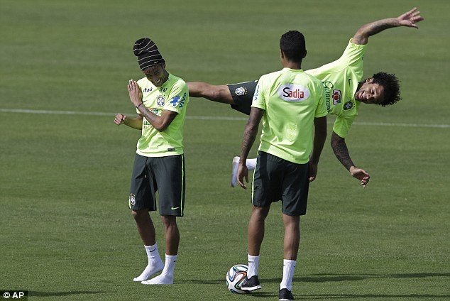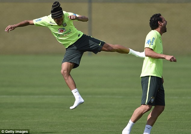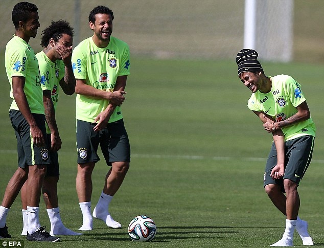 | Trong buổi tập chiều qua của các cầu thủ Brazil rộn rã tiếng cười. Người hùng của trận khai mạc gặp Croatia liên tục có những hành động trêu chọc đàn anh Fred. |