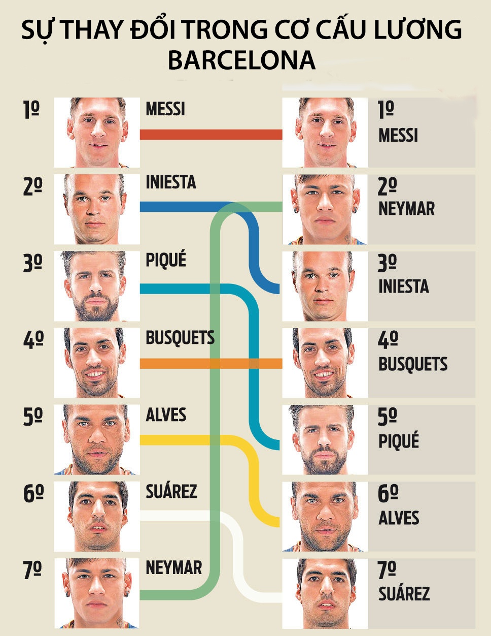 Về phần Neymar, mức lương của tiền đạo này sẽ tăng rất mạnh. Hiện ngôi sao người Brazil đang nhận 7,5 triệu euro mỗi mùa (sau thuế), là trụ cột không thể thay thế nhưng mức lương chỉ xếp thứ 7 tại Barca. Nếu ký hợp đồng mới, Neymar sẽ chỉ thua Messi về khoản nhận lương tại đội bóng này.