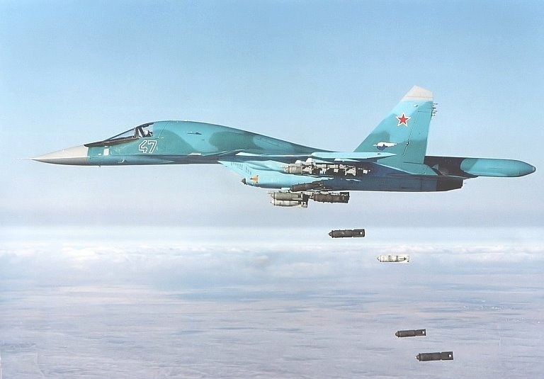 | Su-34 của Nga ném bom các mục tiêu dưới đất. Ảnh: BBC |