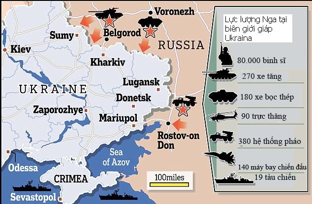 | Tối 12/3, chính phủ Ukraina thông báo Nga điều 80.000 binh lính áp sát biên giới hai nước. |