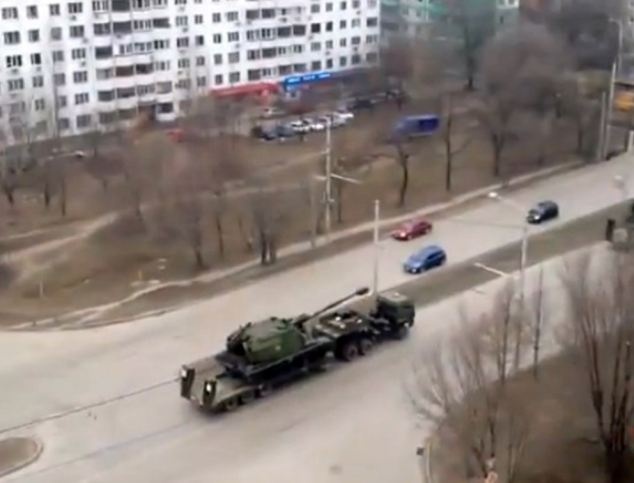 | Ô tô chở xe tăng Nga tại thành phố Rostov, Nga. |
