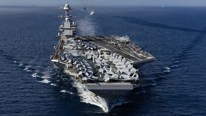 Tàu sân bay USS Gerald R. Ford di chuyển qua eo biển Gibraltar vào ngày 1/10/2025. Ảnh: Hải quân Mỹ. |