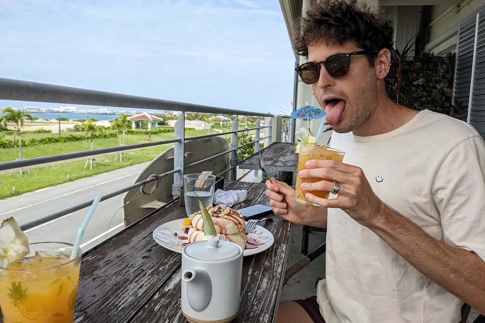 Paul Marshall thưởng thức cocktail và bánh kếp mềm trong chuyến du lịch Nhật Bản. Ảnh: Paul Marshall. |