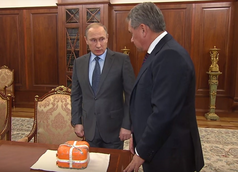 | Bộ trưởng Quốc phòng Nga trình Tổng thống Putin hộp đen của chiếc Su-24 bị bắn. Ảnh: RT |