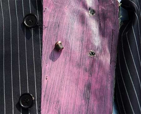 | Loại áo vét chống đạn cao cấp này được quảng cáo làm từ loại chất liệu mạnh hơn thép 30 lần. Nhà may Garrison Bespoke đã mời các nhà báo tới câu lạc bộ Gậy và Súng để bắn thử vài phát vào tượng bán thân được khoác chiếc áo vét kẻ, chống đạn, hai khuy, màu hải quân. |