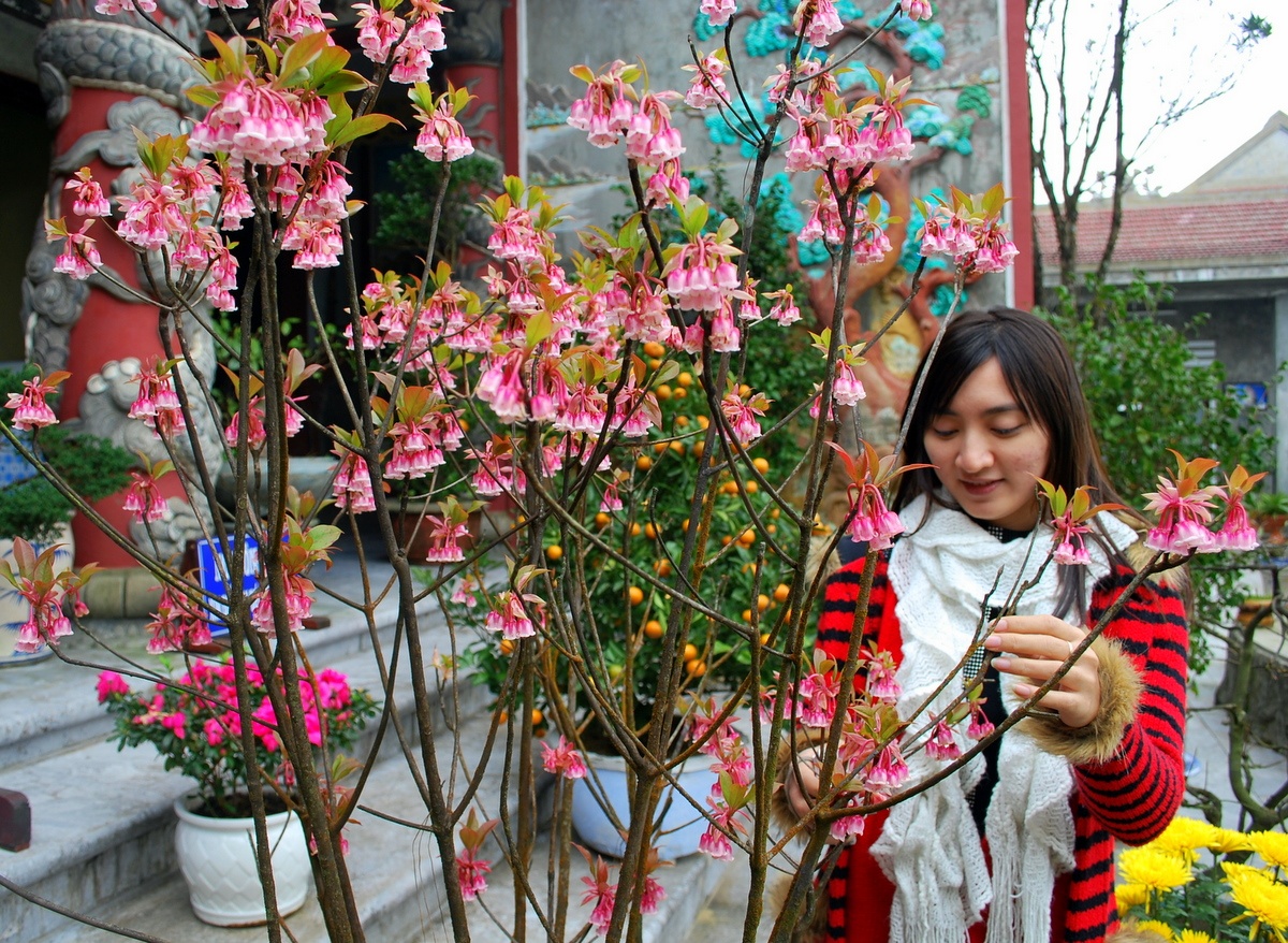 Thiếu nữ ngắm hoa đào chuông trước chùa Linh Ứng.