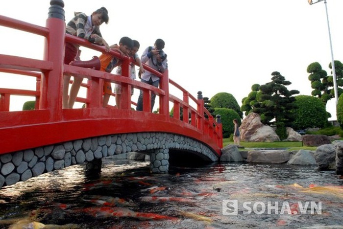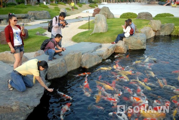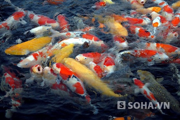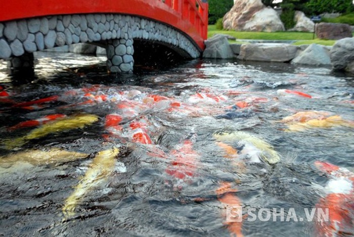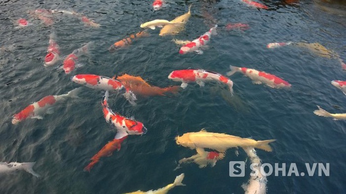| Hiện trong hồ nuôi 220 con các Koi, toàn bộ thức ăn của loại cá này được đưa từ Nhật sang và chúng sống trong môi trường nước 22 - 24 độ C. |