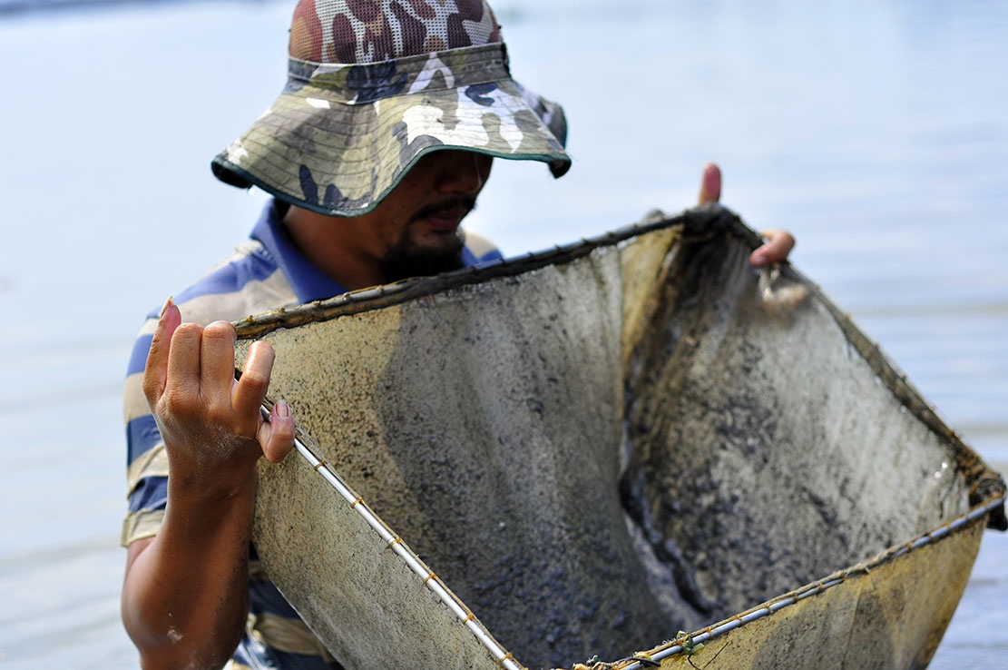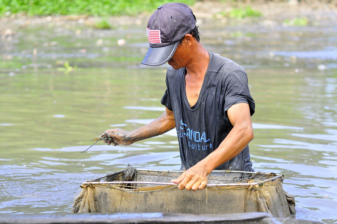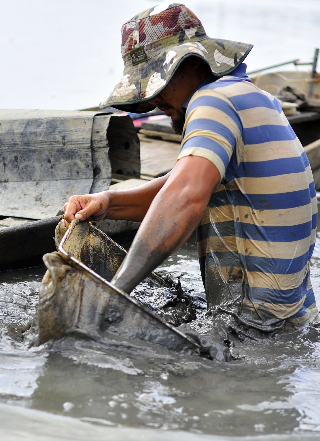 | Nhiều người tự bảo vệ bằng cách đeo găng tay cao su. Vợt dùng để xúc trùn được làm bằng khung sắt to nên có thể ngồi trên thuyền để kéo. "Sạch nhưng hiệu quả không cao. Lượng trùn đãi được chỉ bằng 1/4 so với cách ngâm mình xúc bùn trực tiếp", ngư dân tên Hòa chia sẻ. |