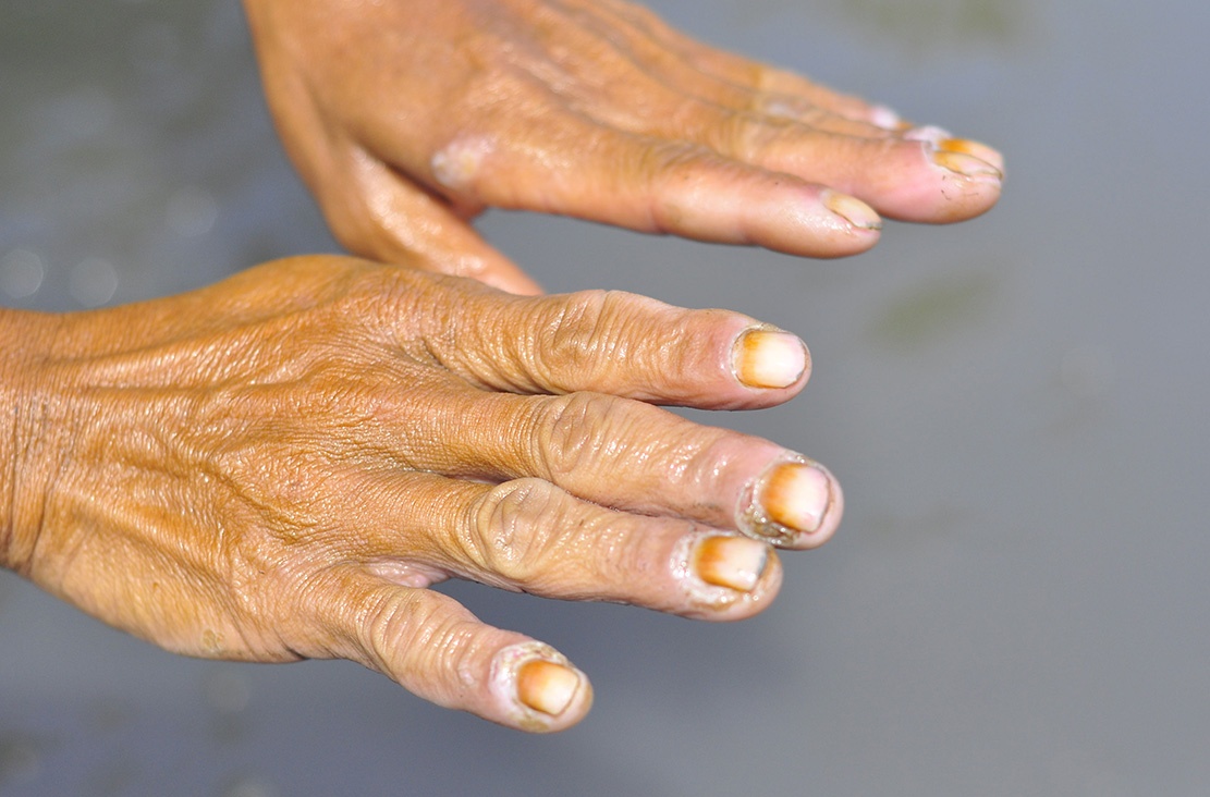 | Ngâm mình dưới nước bẩn suốt nhiều giờ nên hầu hết người hành nghề này bị lở loét, ngứa, bệnh thấp khớp... Theo ngư dân, họ thường xuyên bị rách da, chảy máu do đạp trúng mảnh vỡ thủy tinh. |