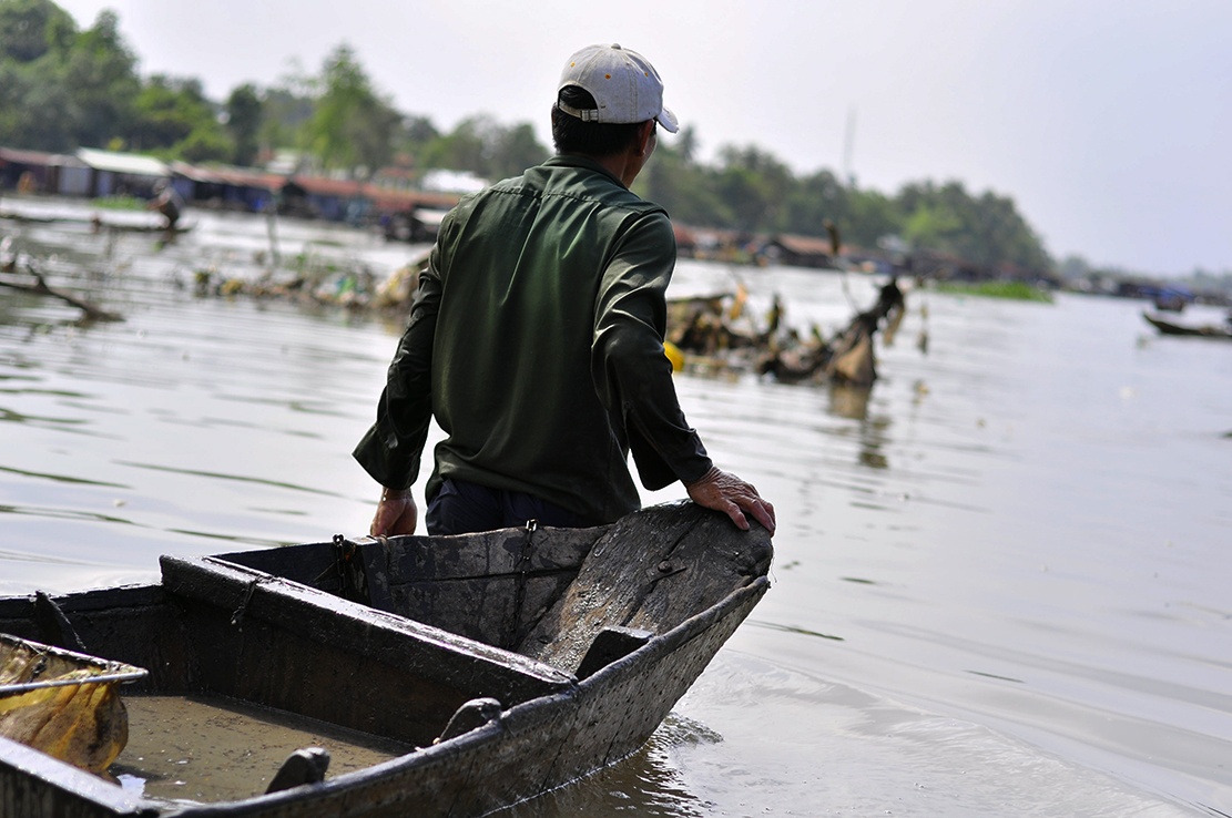 | Người đàn ông chở trùn chỉ đi bán cho các hộ dân nuôi cá bè trên sông Cái (nhánh sông Đồng Nai) tại phường Tân Mai.