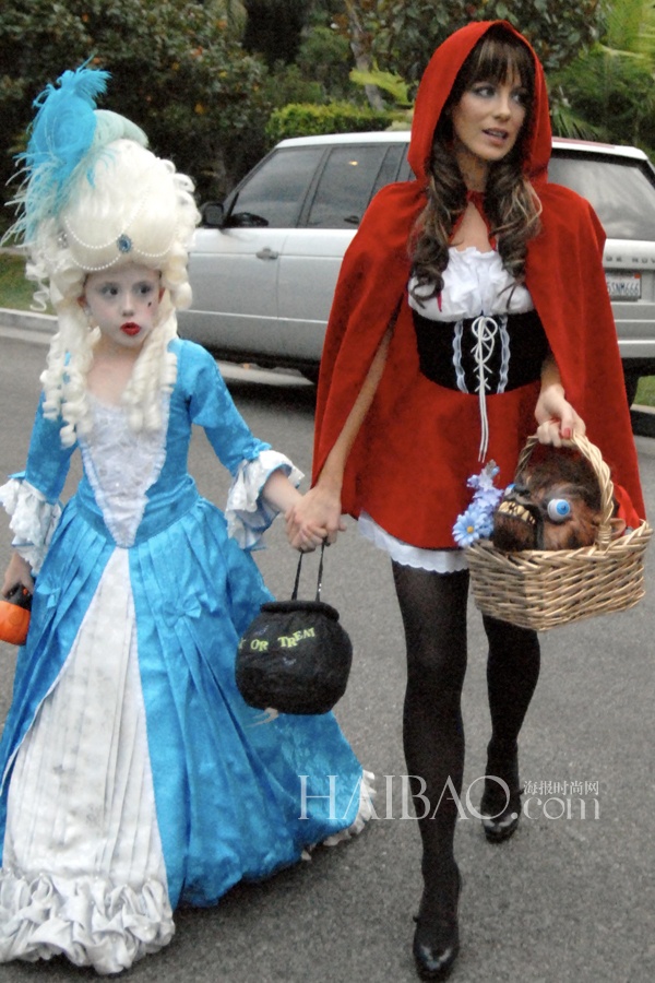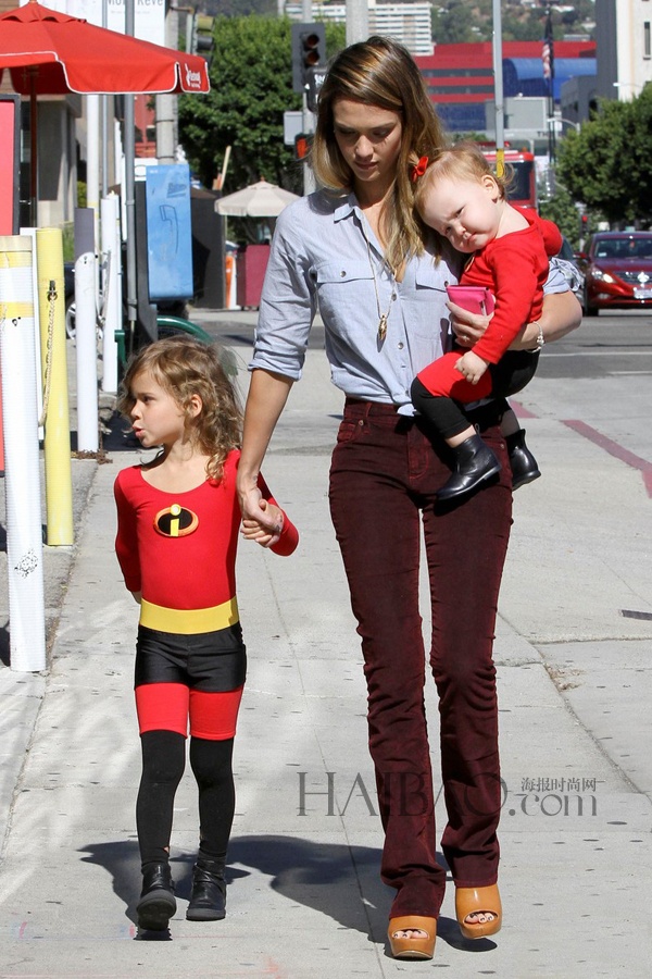 | Honor Marie Warren - con gái "thiên thần bóng tối" Jessica Alba - thích thú khi được hóa thân thành các nhân vật hoạt hình nổi tiếng. Trong hình là mẹ con Jessica Alba với trang phục của Gia đình siêu nhân (The Incredibles). |