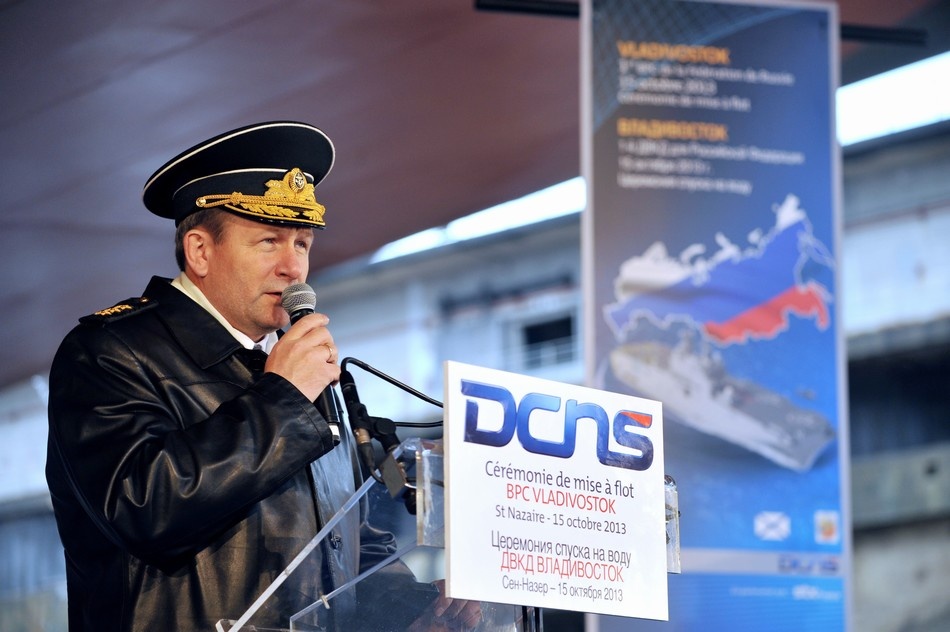 | Đại diện Hải quân Nga phát biểu tại lễ ra mắt tàu đổ bộ trực thăng Vladivostock, loại phương tiện sẽ mang đến một sức mạnh mới cho năng lực đổ bộ của Hải quân Nga. |