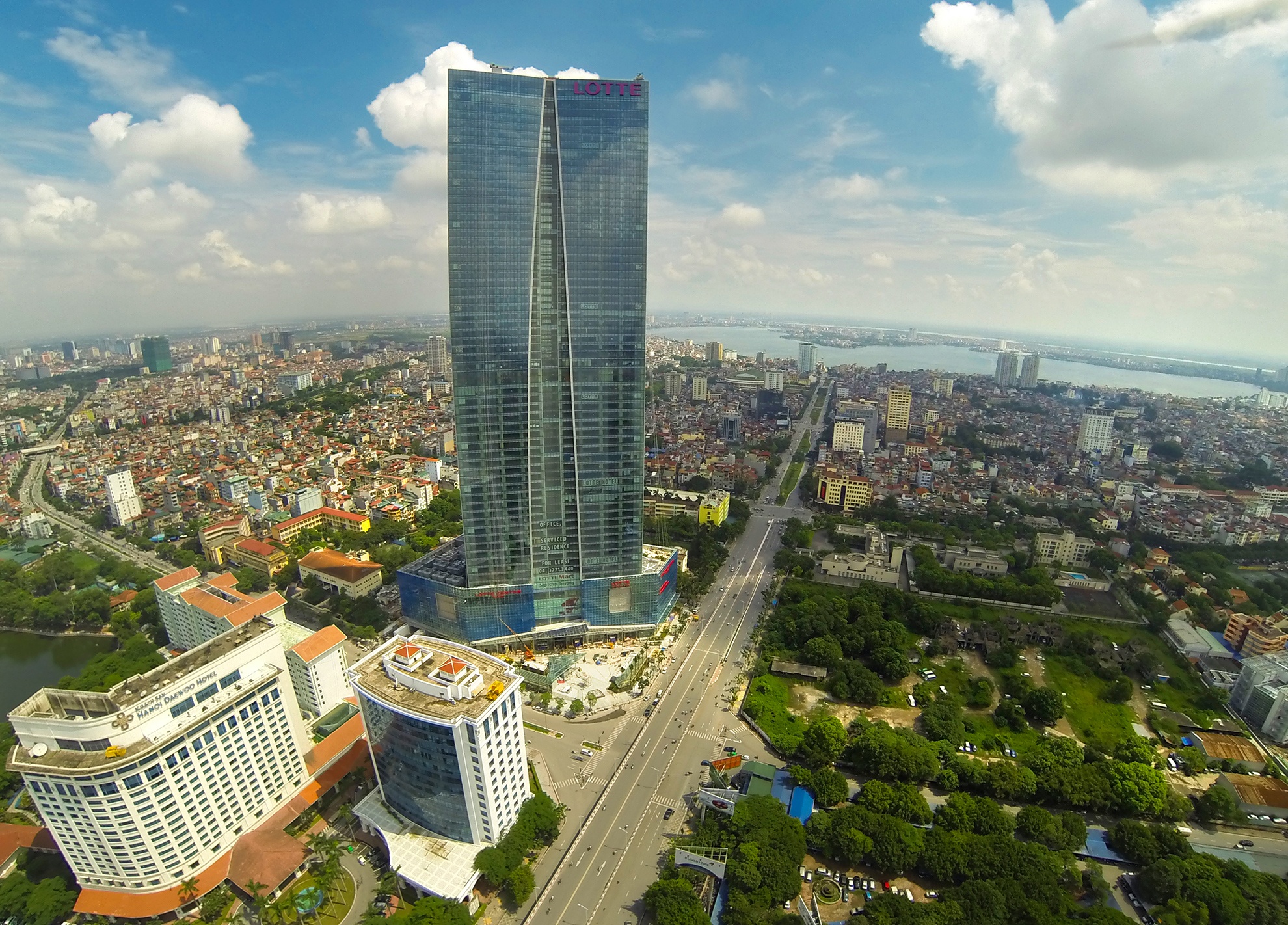 Từ độ cao gần 300 m trên đỉnh cao ốc Lotte sắp khánh thành, bạn có thể phóng tầm mắt xa hơn 10 km để ngắm nhìn 4 hướng thủ đô, từ bờ Bắc sông Hồng cho đến tận quận mới Từ Liêm.