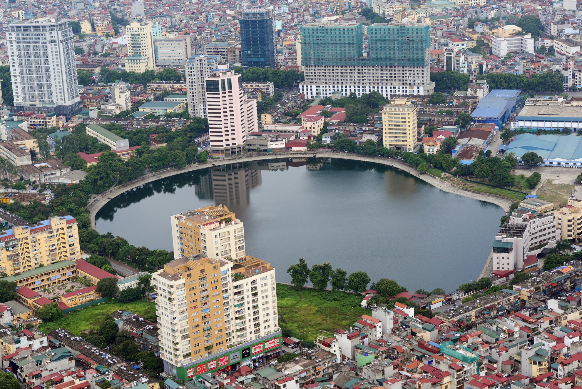 | Hồ Giảng Võ nằm trọn trong góc nhìn từ trên cao. Hà Nội có đến hơn 10 hồ nước ngọt lớn không chỉ tô thêm vẻ đẹp của thành phố mà còn làm cân bằng sinh thái môi trường. |