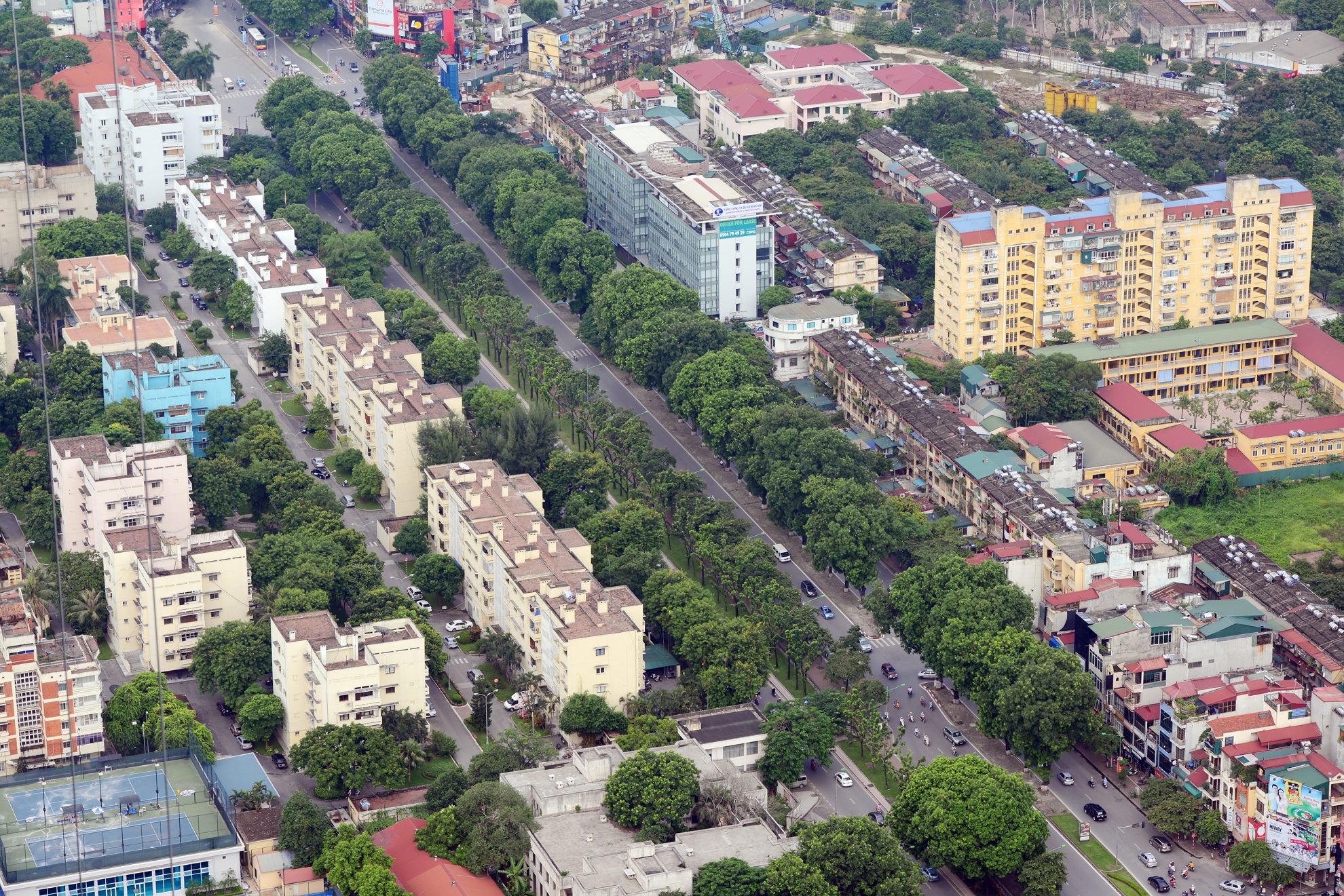 | Một nhà hàng ở vị trí cao nhất Việt Nam sẽ được mở cửa đón khách tại tầng thượng của tòa cao ốc 65 tầng này, đây sẽ là điểm hẹn lý tưởng, độc đáo nhất là với những người yêu thích độ cao và nhiếp ảnh. Trong ảnh là phố Kim Mã với hàng cây đẹp như trong tranh ngay phía trước khu Ngoại giao đoàn. |