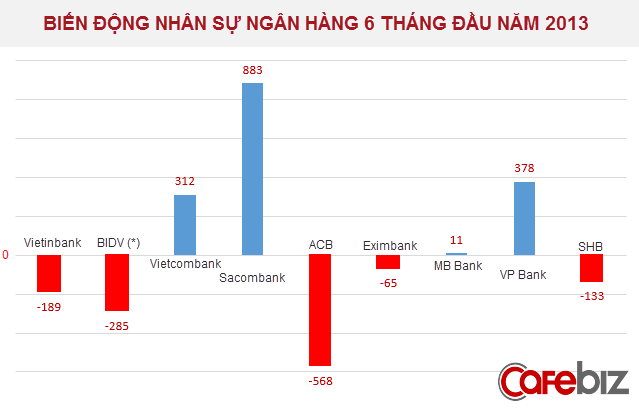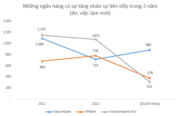 Tại Vietcombank (VCB), 6 tháng đầu năm 2013, tổng số nhân viên của nhà băng này tăng thêm 312 người so với cuối năm 2012 (hầu hết được tuyển mới trong quý II). Tuy vậy con số này vẫn khá khiêm tốn so với mức tăng 1.072 nhân sự mới năm 2012 và 1.150 người năm 2011.