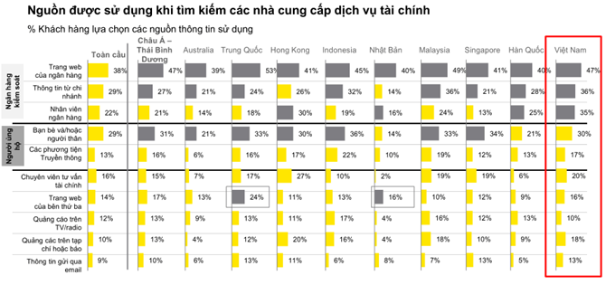 | Đáng chú ý, khách hàng Việt Nam sử dụng Internet như một kênh giao dịch thường xuyên với tỷ lệ xấp xỉ toàn cầu (19% sử dụng giao dịch hàng ngày và 31% sử dụng giao dịch hàng tuần). |